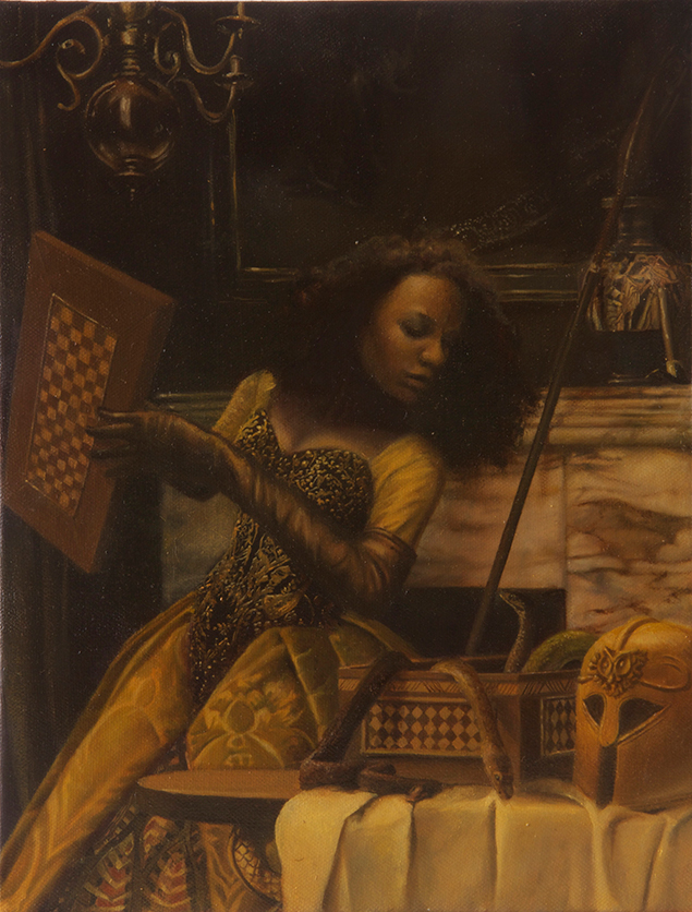 Elizabeth Colombo: Athena, 2015, Oil on canvas, gold leaf frame, 14 x 11 inches and Stephen Hannock: Rockets Over the Delta (Mass MoCA #218), 2015, Acrylic on panel, 8 1/8 x 6 3/4 inches