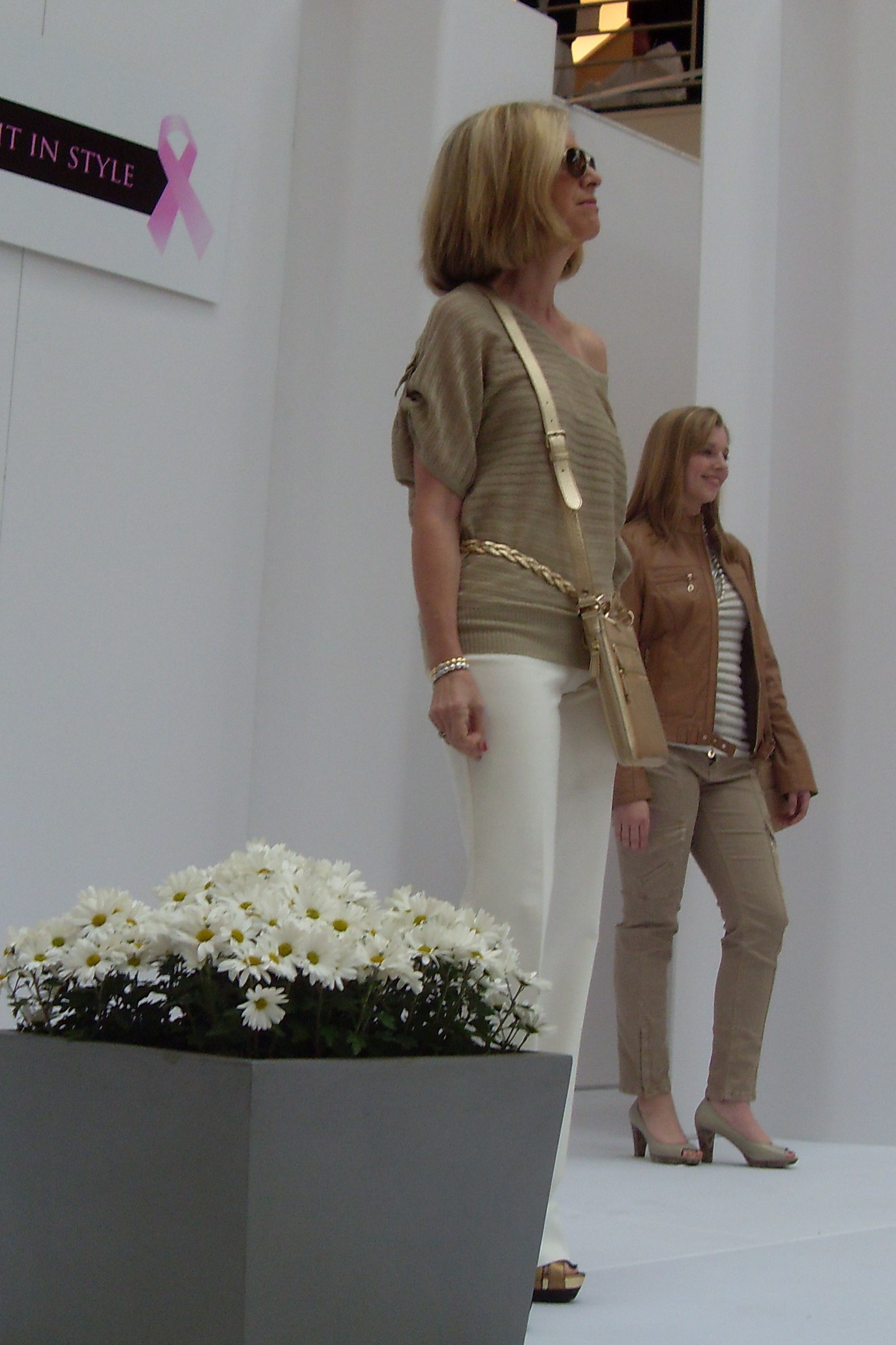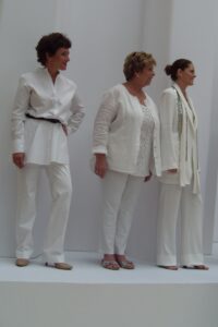 Highlights from the show included tunics in neutral colors such as ivory and white with a touch of glimmering gold, straight leg jeans with checkered shirts and the season’s hot new stylish raincoat in rust and in black with a fullness and flare as the models glided down the runway.