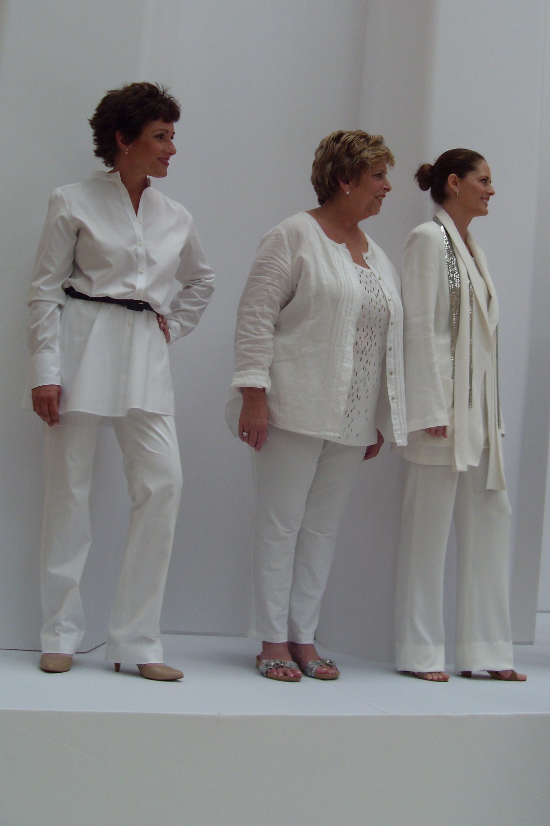Three lovely ladies took over the runway in smart cocktail fashions. A tall, graceful model sauntered down the runway in a champagne tank top and champagne ankle length skirt with a suggestive slit all the way up the leg and a matching linen light coat for a chilly evening. A plum chiffon pantsuit was finished with a top coat and a grey silk pant looked fabulous with a grey top and a bronze jacket. Heavy gold and black necklaces gave a sophisticated appeal to the attire.