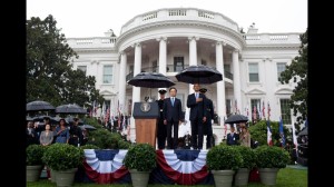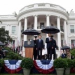 Amidst a steady rainfall, the two leaders shook hands while sheltered by their umbrellas and walked together towards the podium on the South Lawn. To begin the welcome ceremony, the National Anthem of the Republic of Korea was played and then followed by the United States National Anthem. Both Presidents had the opportunity to speak about the continued unification of the two nations and all that has been accomplished to get us to this point. The crowd of patriotic onlookers listened in attentive silence.