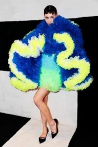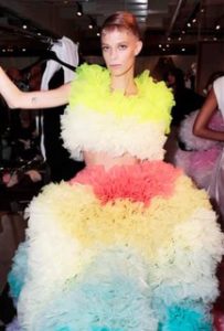 Funny how you never know where life might take you. Tomo Koizumi was a hard-working costume designer in Tokyo just a few months ago. He designed for Japanese pop stars and even Lady Gaga asked Tomo to dress her once while she was in his home country many years ago. He didnât have a large social media presence but instead had the right followers longing to put his name in lights. The designer was simply thrilled to have such famous models as Joan Smalls, Bella Hadid, Karen Elson and Emily Ratajkowski walk a makeshift runway for his very first New York Fashion Week showing. Although the pieces may not be what we know as everyday fashion, each modelâs outfit made a strong fashion statement in magnificent colors of the rainbow and extravagant shapes, sometimes large enough to swallow up the wearer. Each of the pieces was made from Japanese polyester organza in over 400 colors. Ruffles upon ruffles were carefully sewn to create the perfect garment. Koizumi takes inspiration from one of the most powerfully imaginative designers of our era, John Galliano.