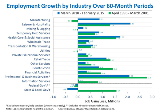 4. The last time the private sector added more than 12 million jobs over five years was April 1996 to March 2001. There are some notable differences between the current stretch of job gains and the one from 1996 to 2001. In particular, the manufacturing sector has added 877,000 jobs over the last five years, while it lost 255,000 jobs during the 1996-2001 period. Moreover, the private-sector job gains during the 1996-2001 period coincided with the addition of more than 1.5 million State and local government positions; in contrast, over the last five years, State and local government employment has on net fallen by 423,000 jobs. The two periods did, however, exhibit remarkably similar job growth in sectors like health care and social assistance, retail trade, and transportation and warehousing. Finally, it is worth noting that the two periods took place at different stages of the business cycle—in 1996, the economy was well into a period of sustained expansion, but in 2010, it was just starting to recover from the worst crisis since the Great Depression. That is why despite the progress that has been made, the President believes more must still be done to capitalize on the recovery and strengthen the labor market.