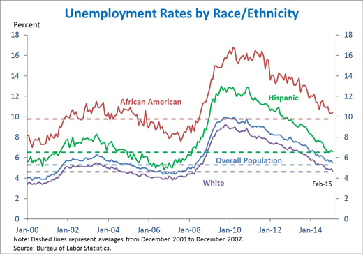 3. While the overall unemployment rate has fallen 1.2 percentage points over the past twelve months to 5.5 percent, the African American and Hispanic unemployment rates have fallen even more quickly, but remain unacceptably high. Relative to last February, the unemployment rate for African Americans is down 1.6 percentage points, while the Hispanic unemployment rate is down 1.5 percentage points. Reflecting these large declines, the African American and Hispanic unemployment rates are nearly all the way back to their pre-recession (2001-2007) averages. Despite this progress, however, it is important to note that these groups endured much larger percentage-point increases in unemployment rates during the recession, and a return to pre-recession averages would still leave these rates at high levels. This is why the President has proposed a number of policies—including the My Brother’s Keeper initiative for young men of color and tax relief for working families—to help reduce disparities in labor market outcomes.
