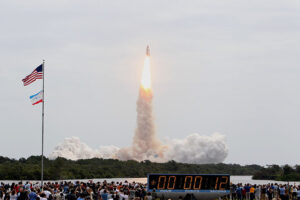 Despite the odds that weather would delay the launch, Atlantis took off at 11:29 A.M. EST with only one minor glitch in the communication countdown due to an improper vent arm retraction that was easily corrected.