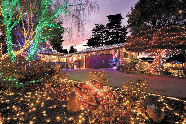 Inside the magnificent Christmas tree is adorned with bulbs shining bright,