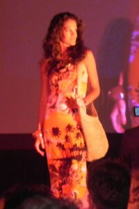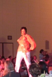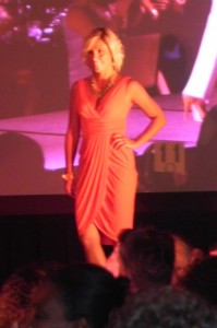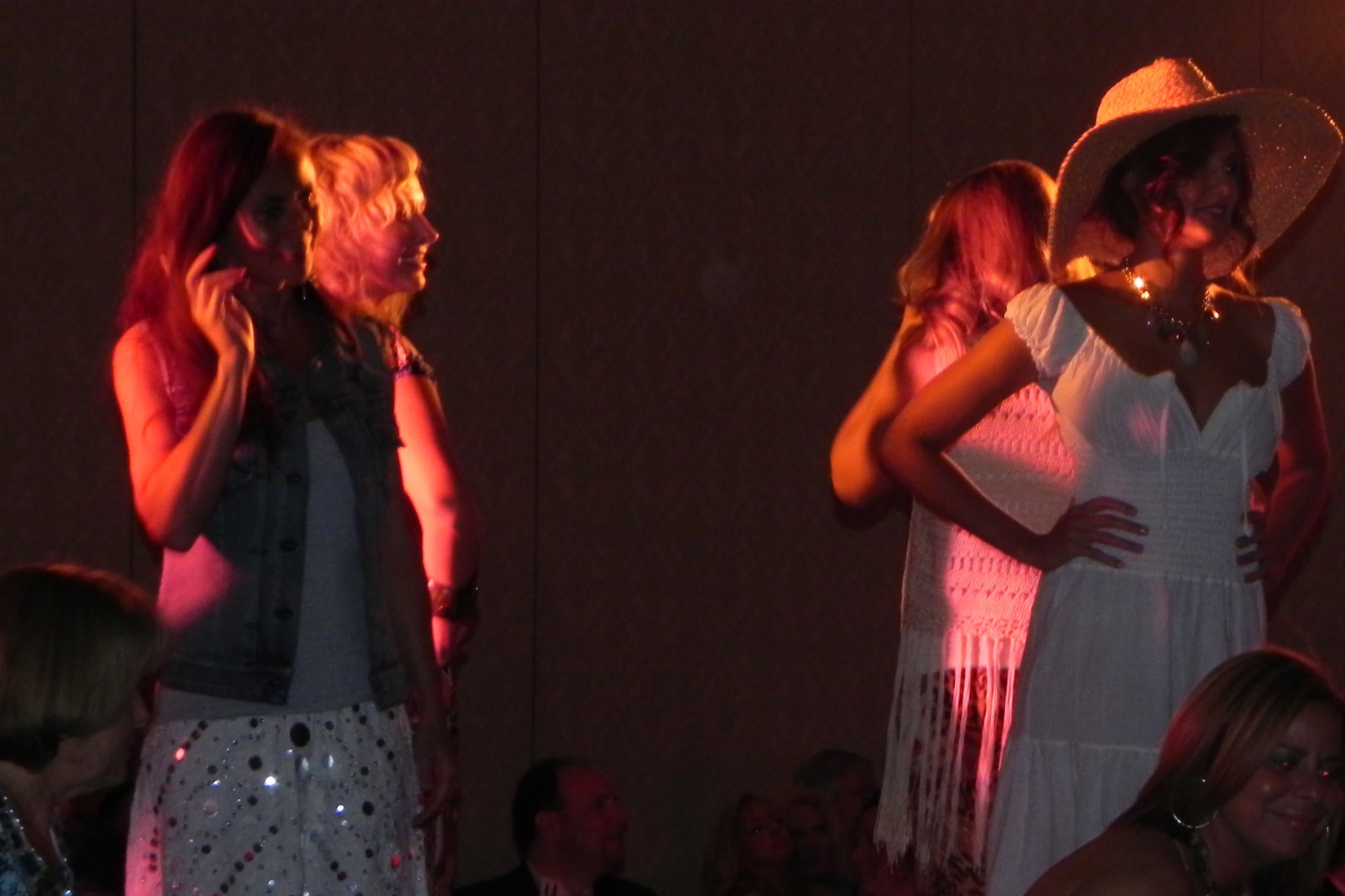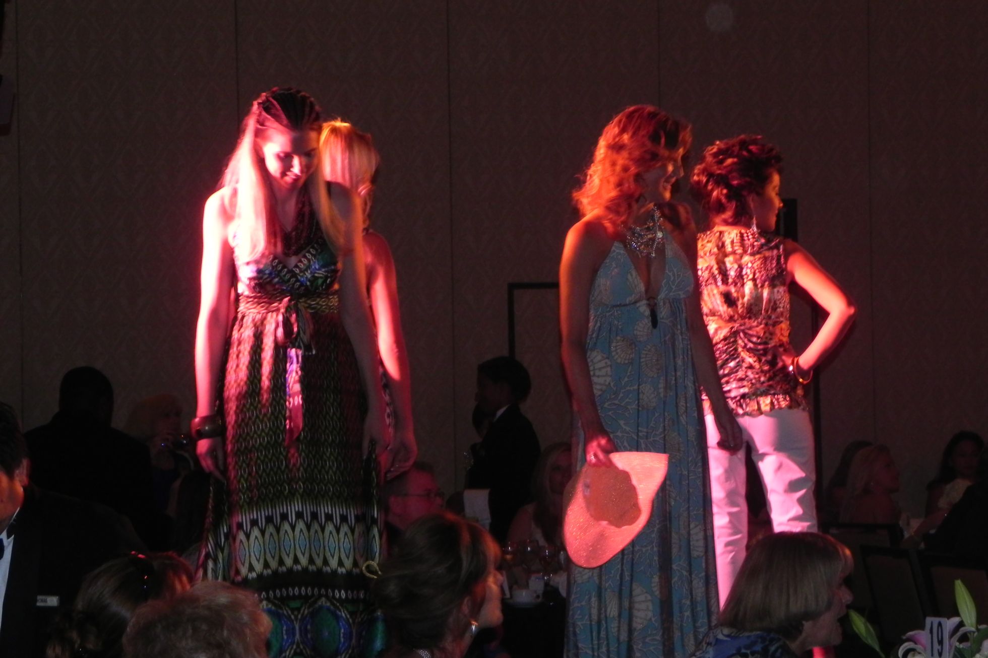 The big hit of the evening was the energized fashion show that transformed the room into a tropical paradise. There were clothing combinations in festive prints, sparkling solids and all the latest trends wrapped into a festive presentation of style. Dresses came in all lengths for daytime and nighttime. The maxi dress seems to be here to stay with the ocean getaway dress and the bright abstract dress, both of which were paired with chunky necklaces. The solid sheath dress is always popular with the square neckline and dressed up with a thin jeweled belt and large flattering necklace. A pretty blond model graced the runway in a romantic shimmer dress with ruffles across the length of the top. Accentuate your figure with the draped Grecian dress in bright orange with seamed empire waist. The innocent peasant dress took on a couple of great looks. A paisley print scoop neck dress would be perfect for an afternoon affair or the puckered peasant dress in white is the answer to a sunset beach party. Don’t forget to throw on a wide-brimmed hat to protect you from the UV rays of the sun. Long skirts are great paired with solid white tees topped with a fringe or a denim vest. As the runway began to heat up, a couple of striking swimsuits made their way down the catwalk. With summer comes the white pant which is versatile enough to wear with any kind of top. We saw the long sleeved ruffle top and the embellished pink tunic top with wide sleeves worn with white jeggings. The clothes kept coming in an array of styles, colors and looks.