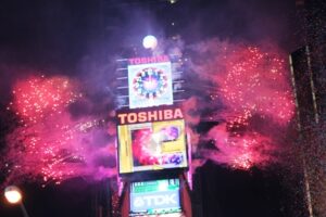 Opening ceremonies began at 6:00 PM with the lighting and raising of the Times Square New Year’s Eve Ball. The giant switch was flipped to light up the ball and begin its ascent accompanied by special pyrotechnic effects atop One Times Square.