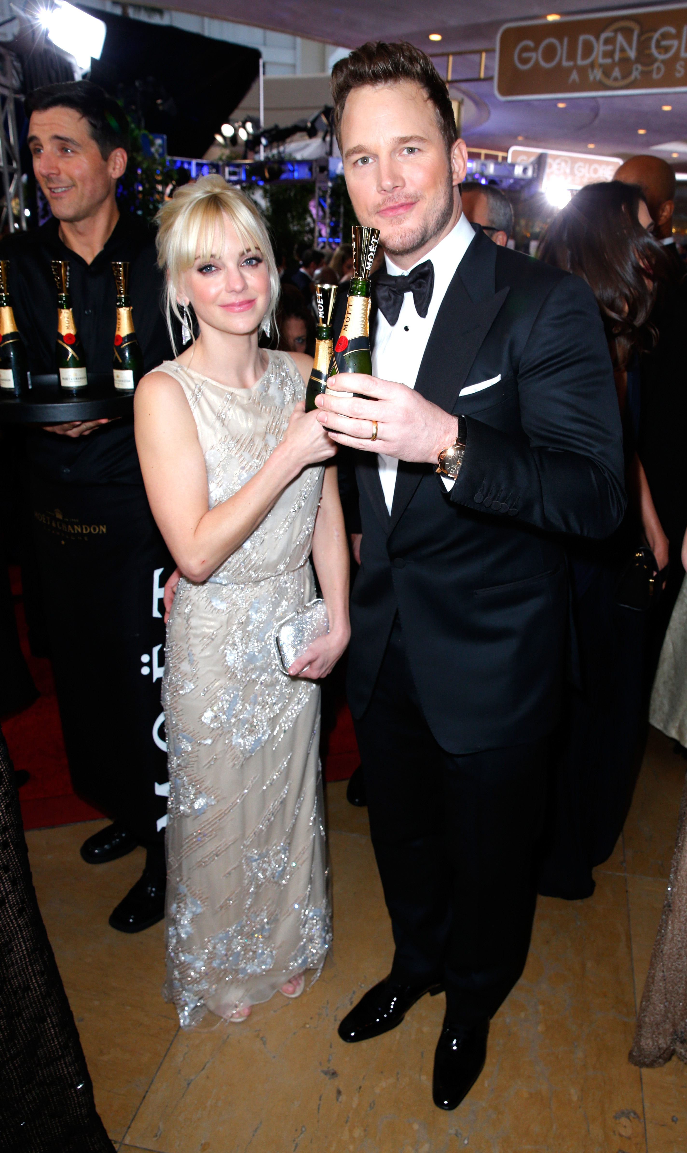 Photo Credit: Michael Kovac for Getty Images, Anna Faris and Chris Pratt “Toast for a Cause” with Moët & Chandon Impérial minis at the 72nd Annual Golden Globe Awards