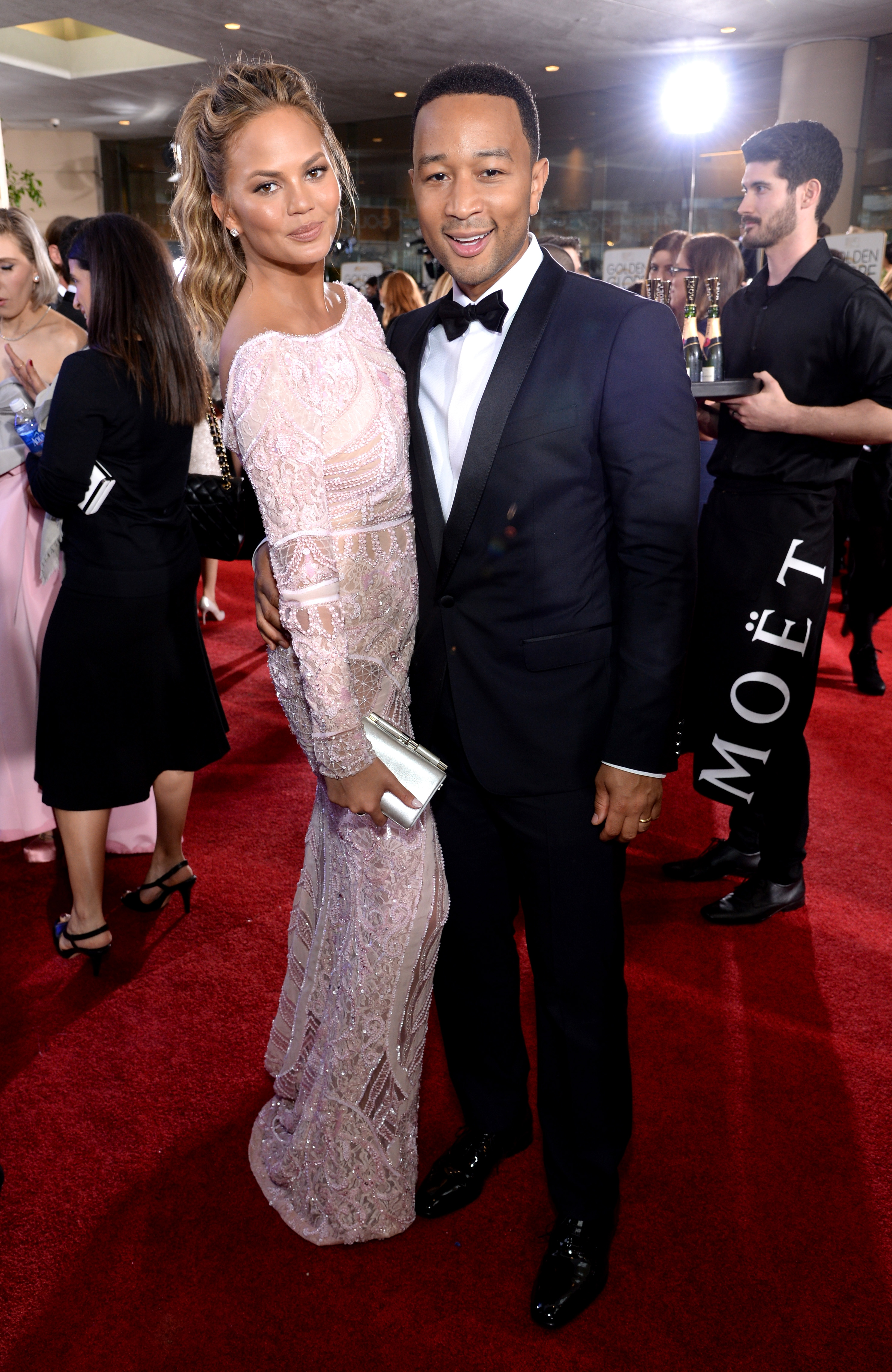 Photo Credit: Michael Kovac for Getty Images – Model Chrissy Teigen and Singer-songwriter John Legend “Toast for a Cause” with Moët & Chandon Impérial minis at the 72nd Annual Golden Globe Awards