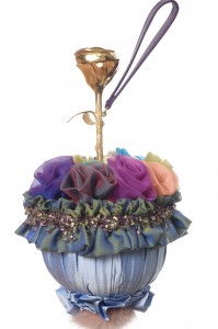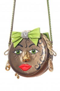 The Aperture Collection takes us to the opera, pursuing beauty as a state of grace and a way to return to innocence. Symbols such as wheels, hearts, bullfighters, faces, paper bins, circus tents, suitcases, lyres and world globes catch your fancy. The umbrella purse is adorned with a fox fur pompom and raw silk organza hand sewn applique roses. They are all so imaginative and decorative.