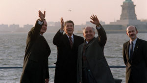 Ronald Reagan, Mikhail Gorbachev, George Bush all wave to the press corps. Film still from THE REAGAN SHOW. Photo credit: Ronald Reagan Presidential Library.