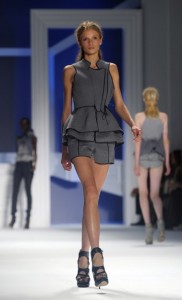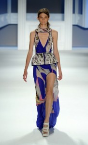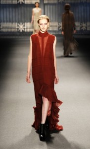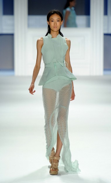 The latest showing of Wang’s Spring 2012 Collection at Mercedes-Benz Fashion Week Spring 2012, combined bright and vivid colors with neutrals and traditional sheaths and tailored dresses became provocative in original shapes with the V-neckline signifying glamour. Small sequins and large slits were extremely suggestive.