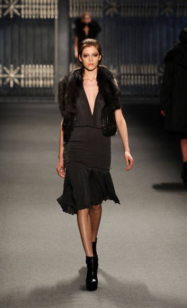 While the looks of Wang’s collections are sometimes simple in a sophisticated way, the amount of detail and intricacy that go into the designs are amazing. The Fall 2011 Collection mixed fur and feathers with sheer lightweight fabrics layered and flowing with that feminine attitude.