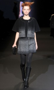 Outerwear was magnificent as a model glided down the runway in a blue tweed pagoda coat with flower pin applique and another marched down in a black tweed emperor overcoat. There was nothing more unique then the Black Opera quilted Empress Hooded Raincoat with removable fur trim.