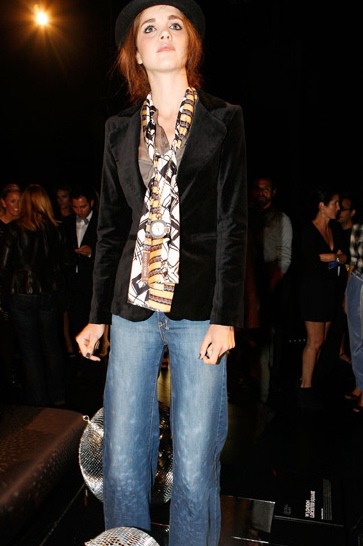 A simple tailored gray shirt worn over blue jeans can be dressed up with a black velvet suit jacket and a unique black and white silk scarf. Put on the rounded black hat and head out the door.