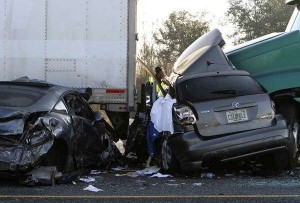 Heavy fog and unstable driving conditions caused a massive pileup of vehicles on I-75 South of Gainesville in Florida. Cars and trucks collided as drivers became blinded by smoke and fog in the early morning hours. There were 18 people hospitalized and at least 10 were killed. It was an ominous sight and those that made it out were haunted by the cries and screams and the sound of cars crashing. Six tractor-trailers were involved and some burst into flames. The Interstate was closed for most of Sunday and the huge accident is under investigation as to whether the brush fire, thought to be the cause, was intentional or not.