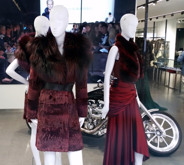 Dennis Basso strays away from classic to take us to a different world of crazy beauty as he goes cutting-edge with enticing outerwear, gowns and dresses that are painted in the magical and powerful color of merlot. With a full-size motorcycle as part of the display, these pieces are teasing you to ride off into the sunset at fashionable speeds. Â Come along for the ride and let your hair blow in the breeze.
